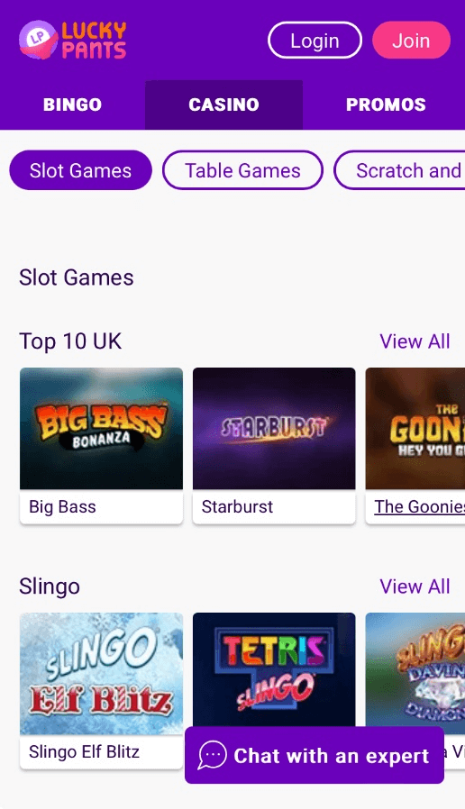 The bingo and casino options at Lucky Pants are the exact opposite of pants! We love the range of bingo variants and rooms, and the casino tab is the perfect home for some innovative titles, including Live Dream Catcher with its live stage host and massive Money Wheel.