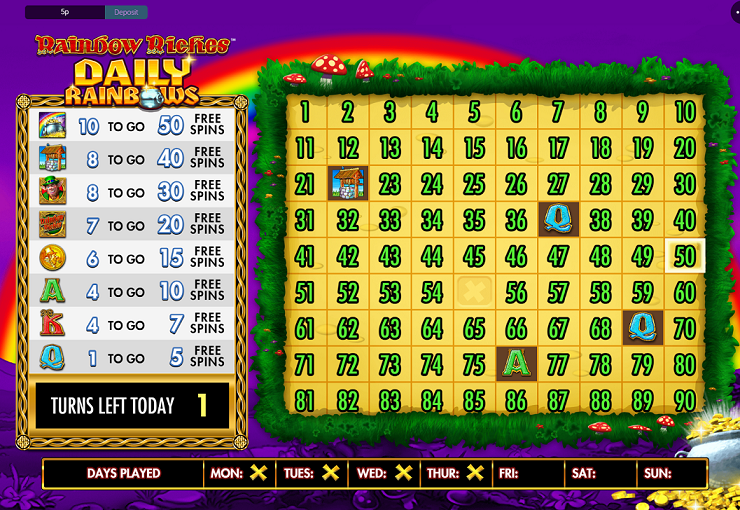 These are bonuses where you visit every day to undertake an activity, which over time can deliver free spins or bonus rewards. One of the most obvious is at the Ballys/Gamesys brands like Jackpotjoy and Virgin Games. They take some of their most popular games and make a large grid of symbols that you will find in the game. Then every day they award 6 picks and prizes are allocated by the number of specified symbols revealed. So an example is Rainbow Riches Daily Rainbows at Jackpotjoy. This offers all free spins as prizes from 5 free spins to 50 free spins, but you have to collect from 3 Queens for the lowest prize to 10 pots of gold for the highest.