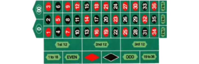 American roulette is identical to European roulette except that the roulette wheel used has thirty-eight sections – the numbers 1 to 36, a 0 and a ’00’. All outside bets lose when the ball land in either 0 or ’00’, both of which are coloured green.