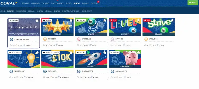 The minimum deposit for most payment methods at Coral Bingo is £5 and this money will appear instantly in your account.